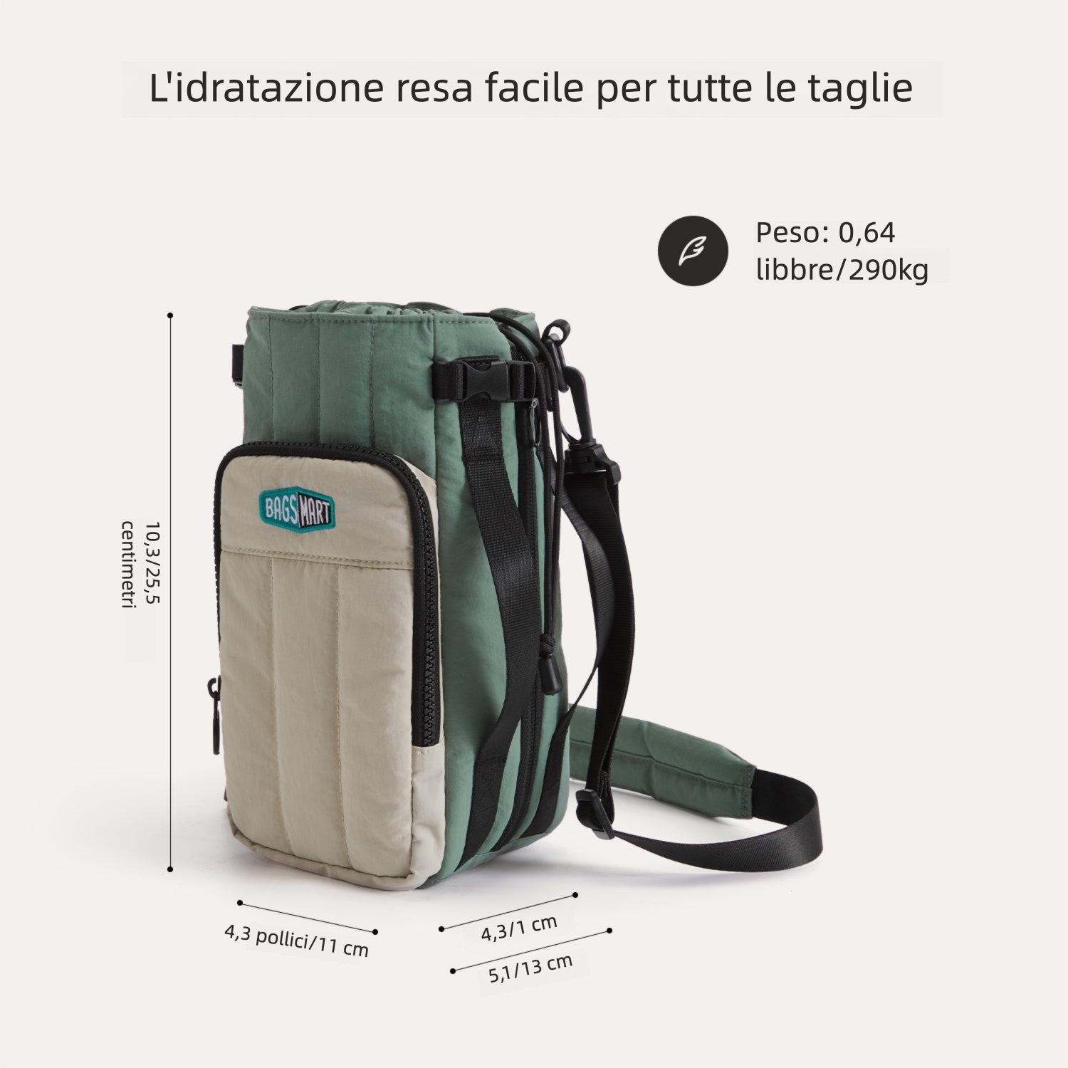 - Tasca frontale con zip: 11 × 20 × 2 cm (4.3" × 7.9" × 0.79")
