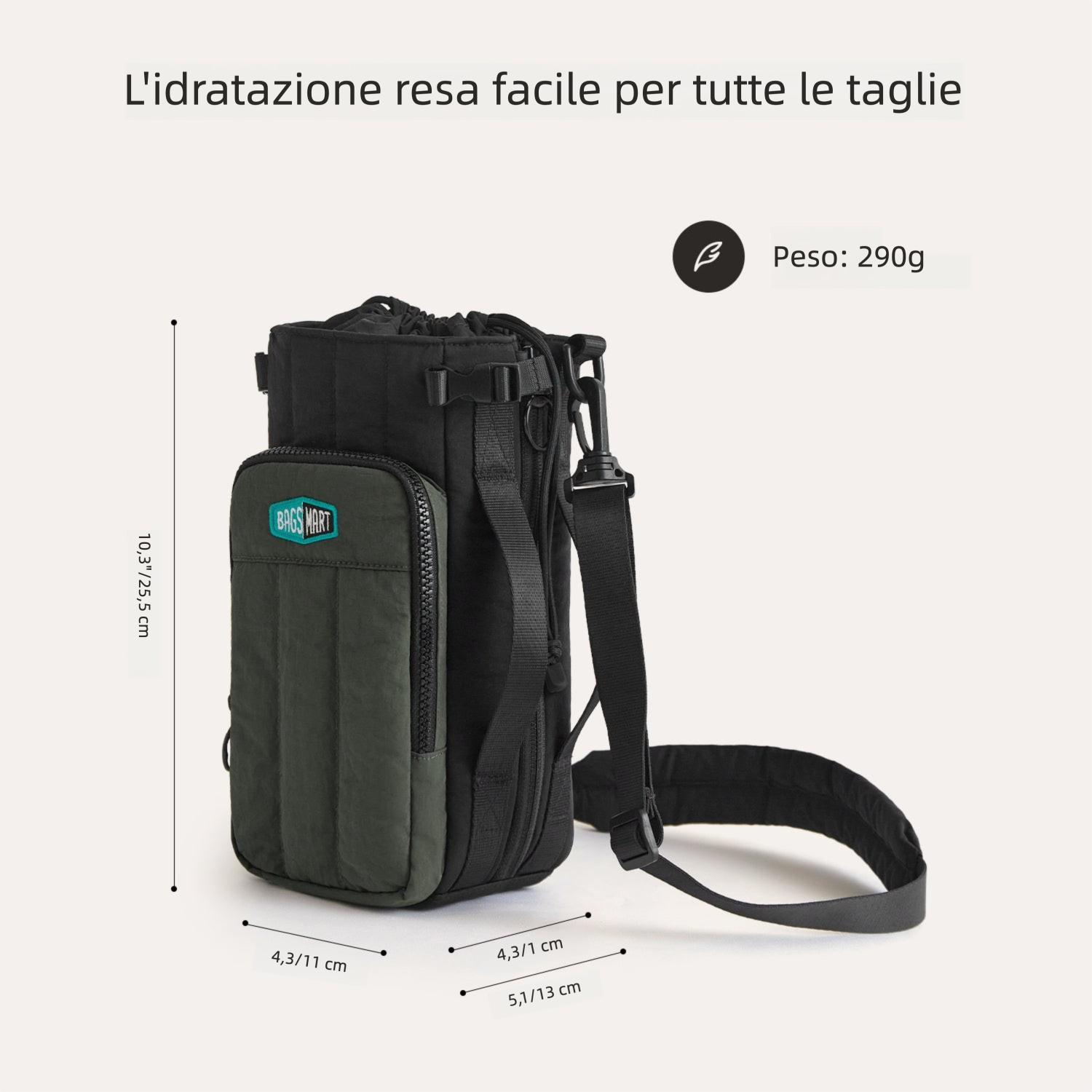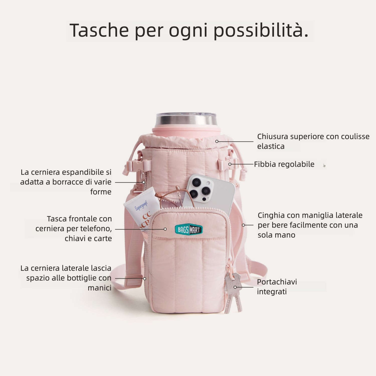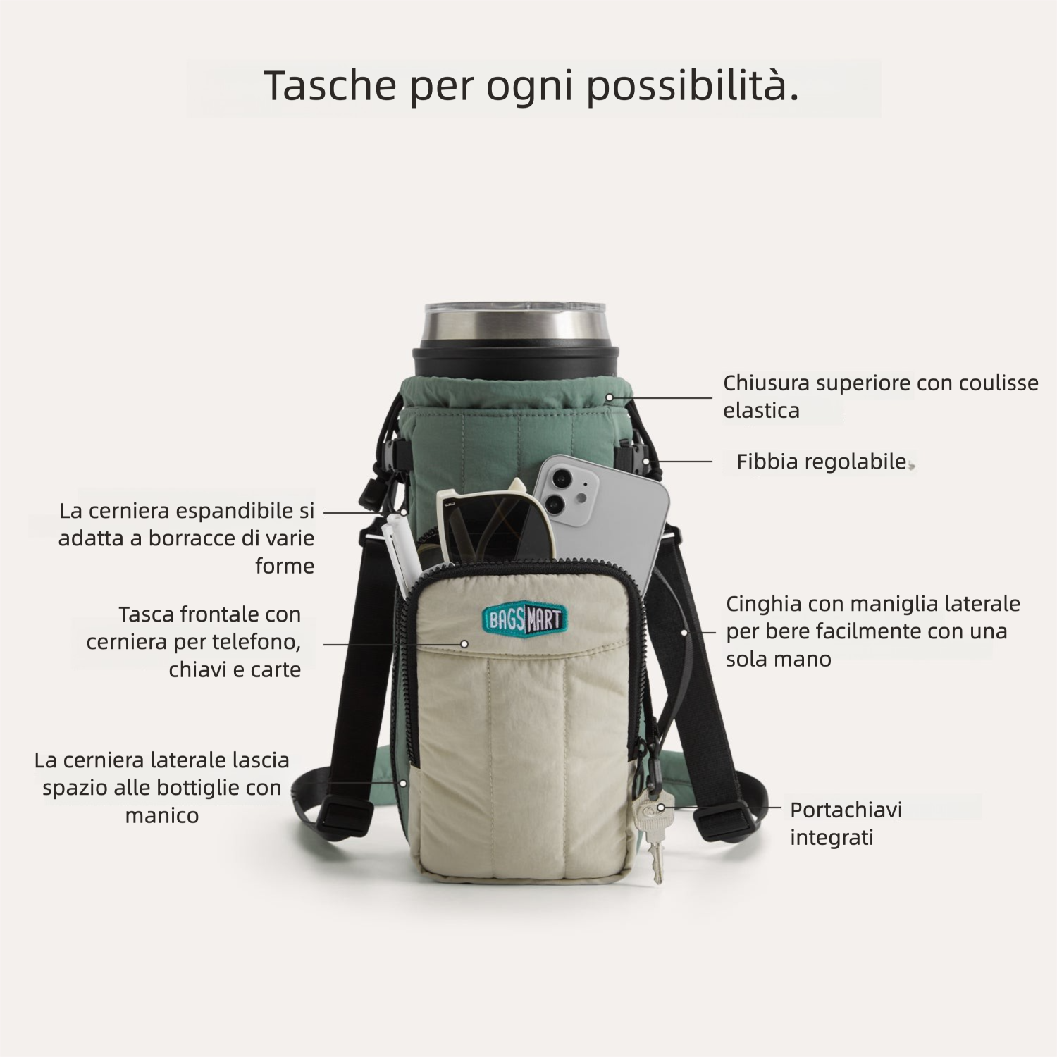 - Espandibile: zip di espansione + tasca esterna con cordino per borracce da 32oz fino a oltre 64oz.