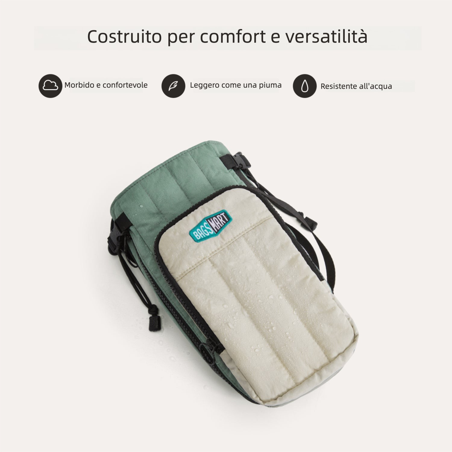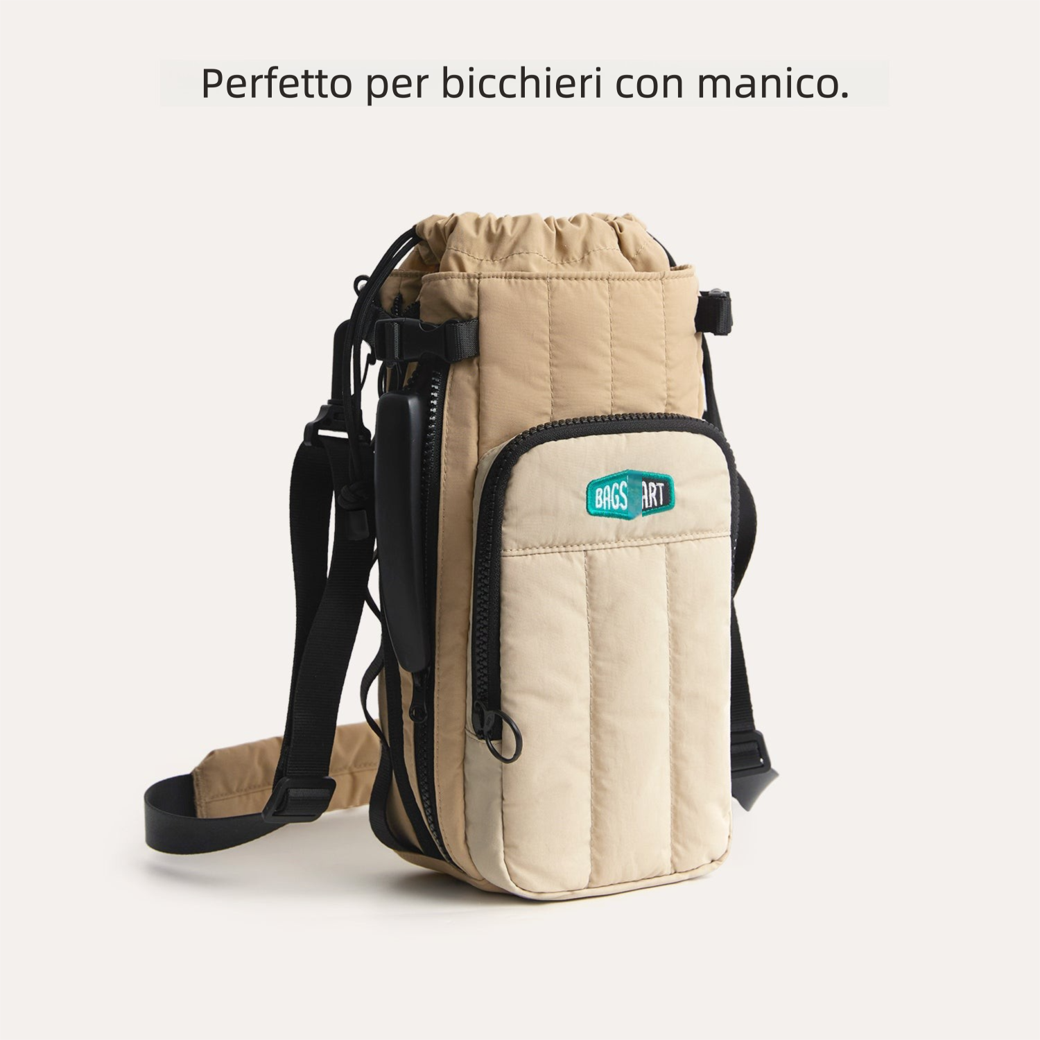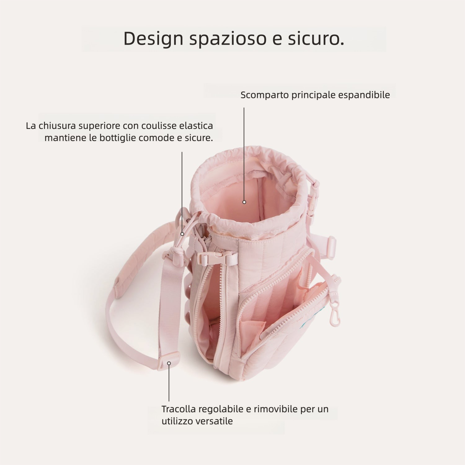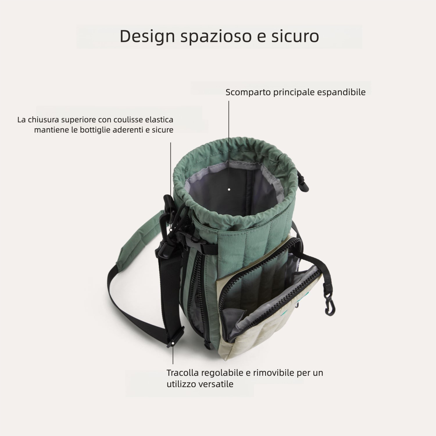 - Versatile: zip laterale che lascia spazio ai contenitori con handle/manico.