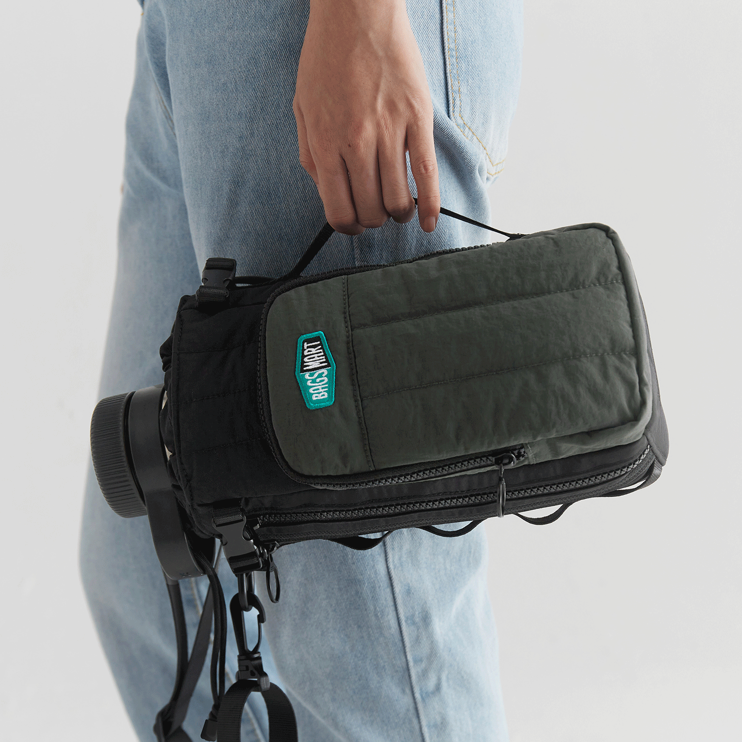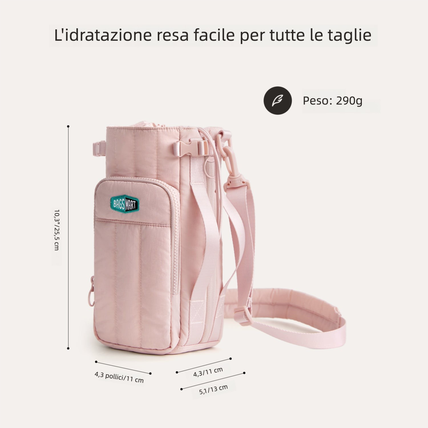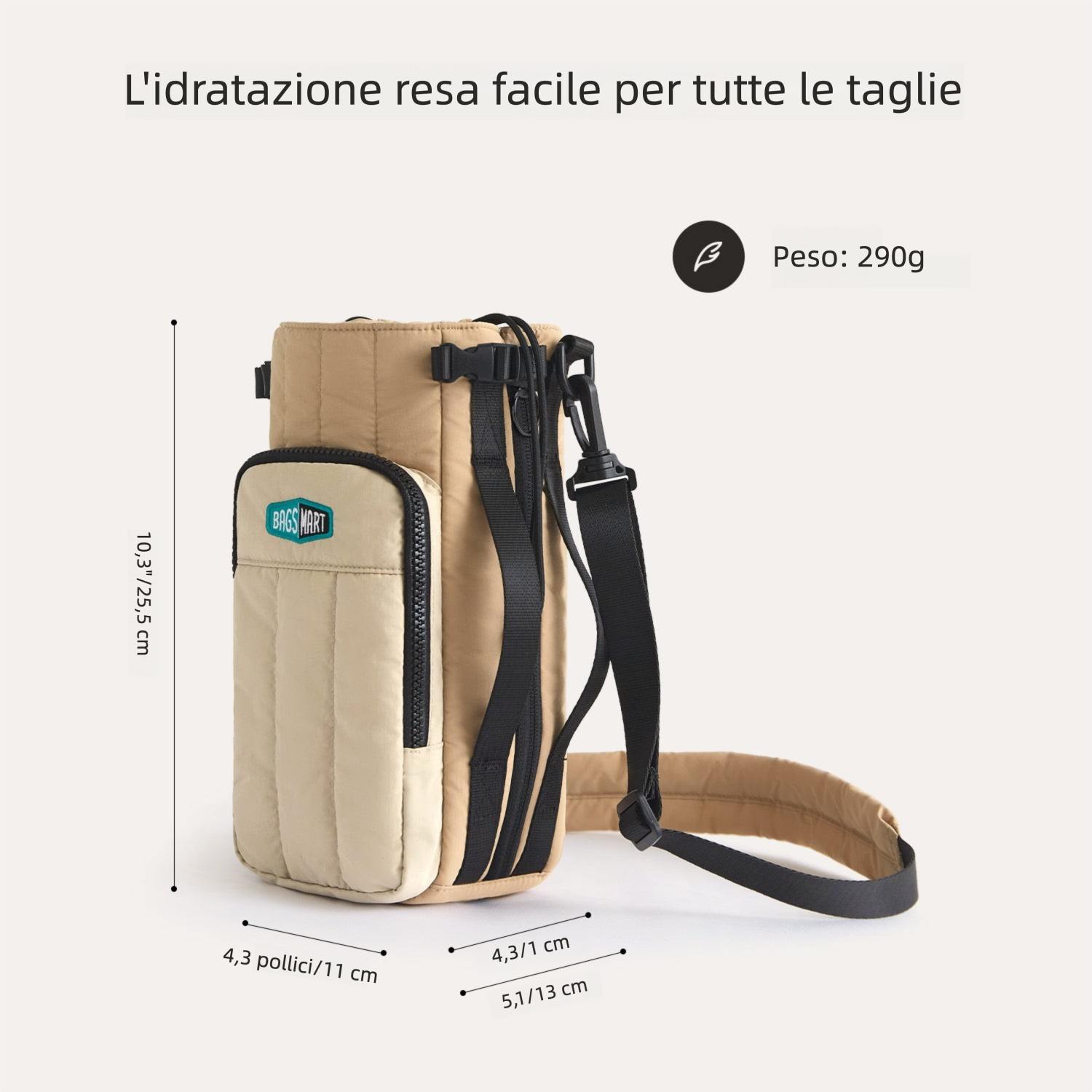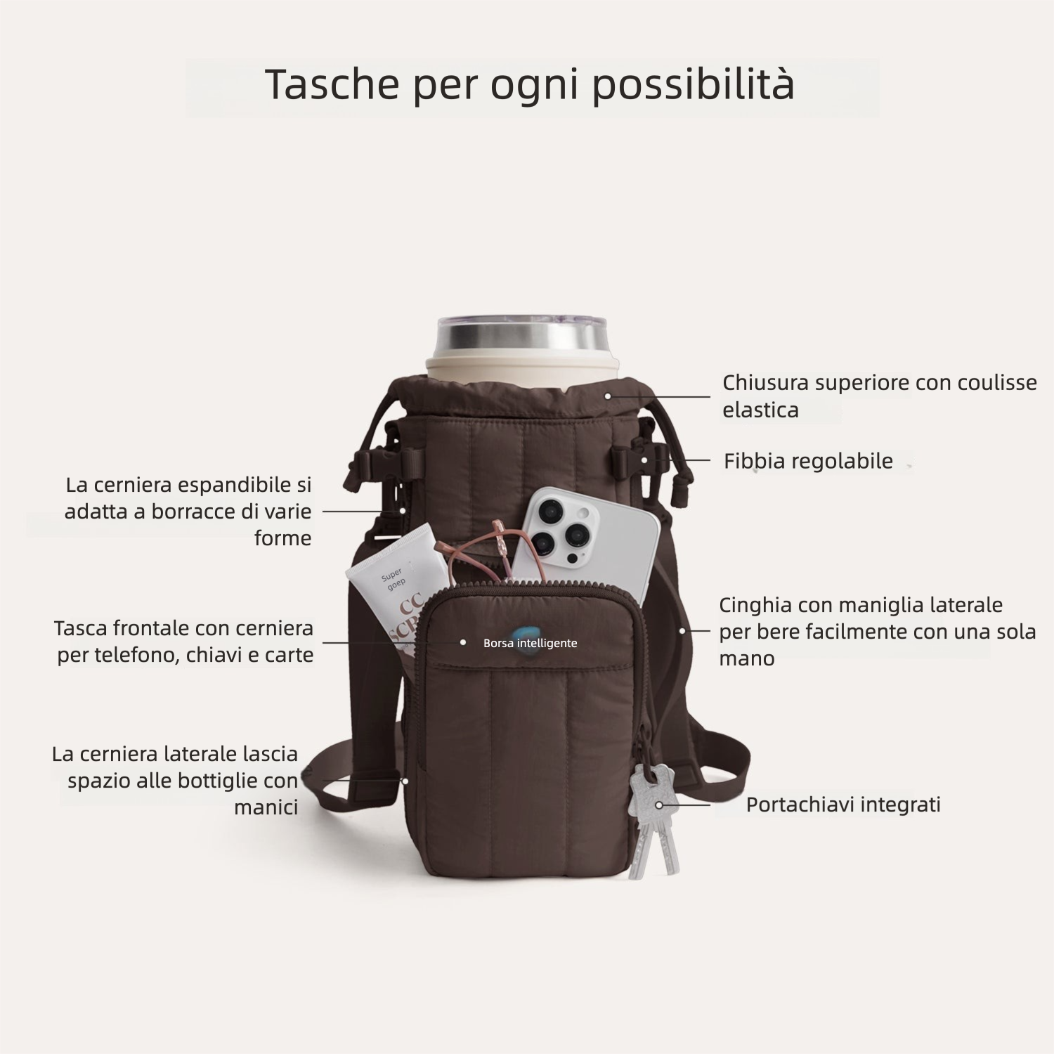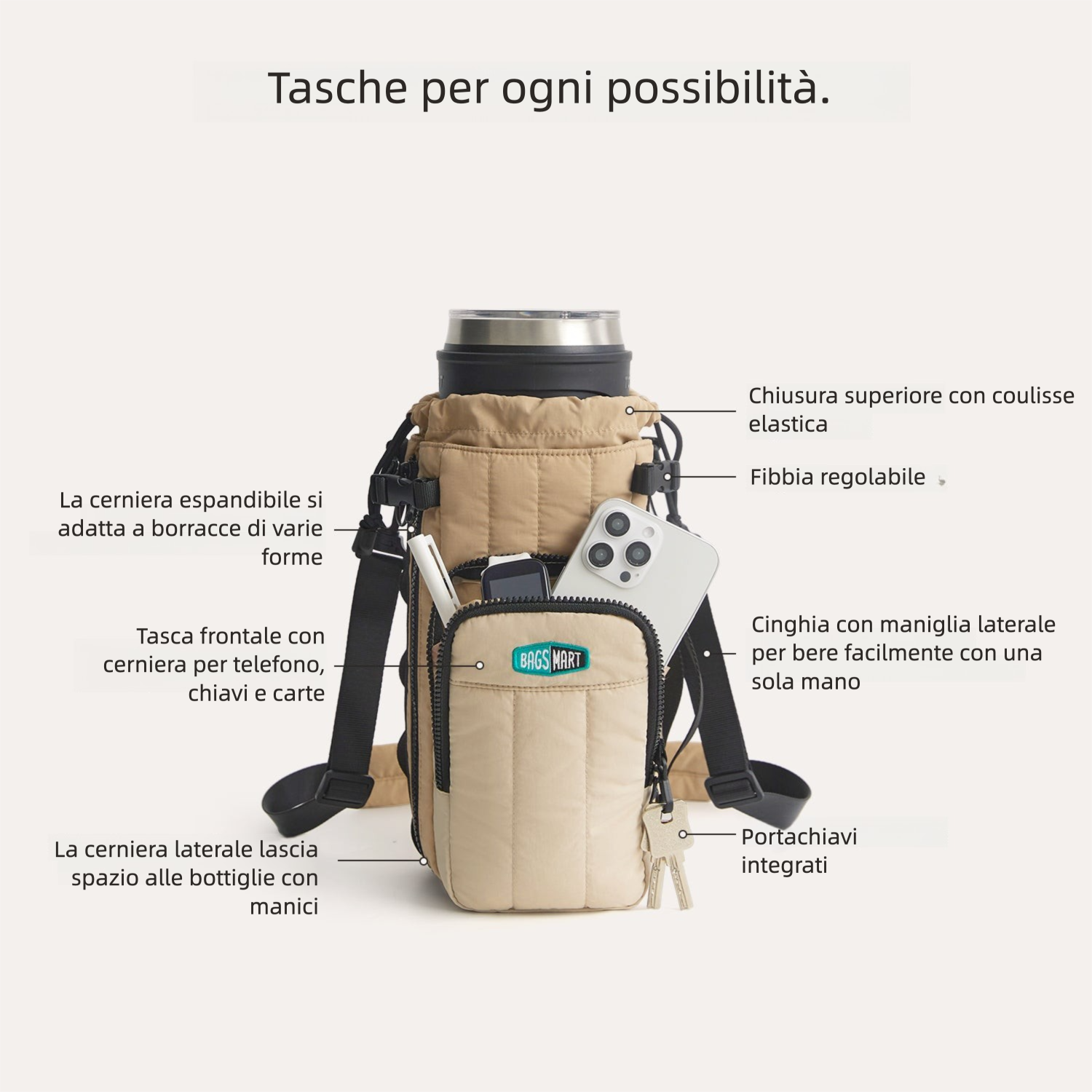 - Versatile: zip laterale che lascia spazio ai contenitori con handle/manico.