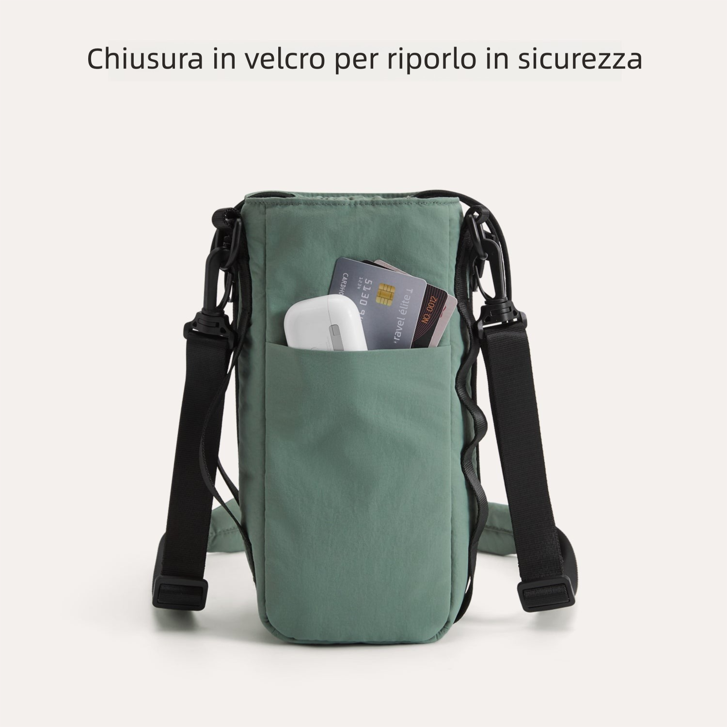 - Sicura: ampia tasca frontale con zip e key leash per telefono/chiavi/carte.