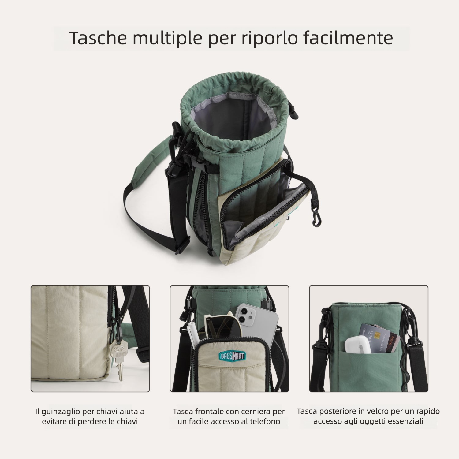 - Tasca frontale con zip per telefono, chiavi e carte