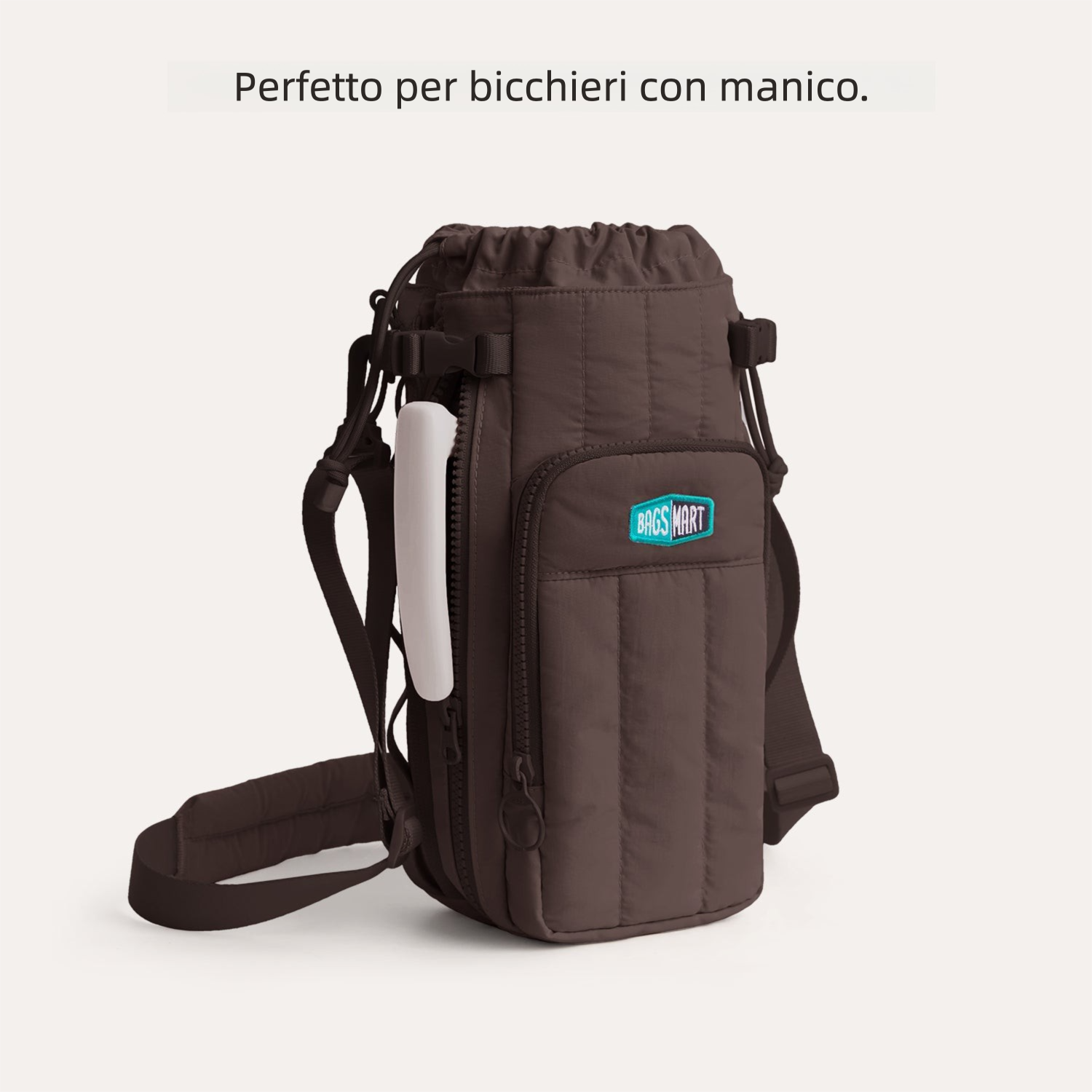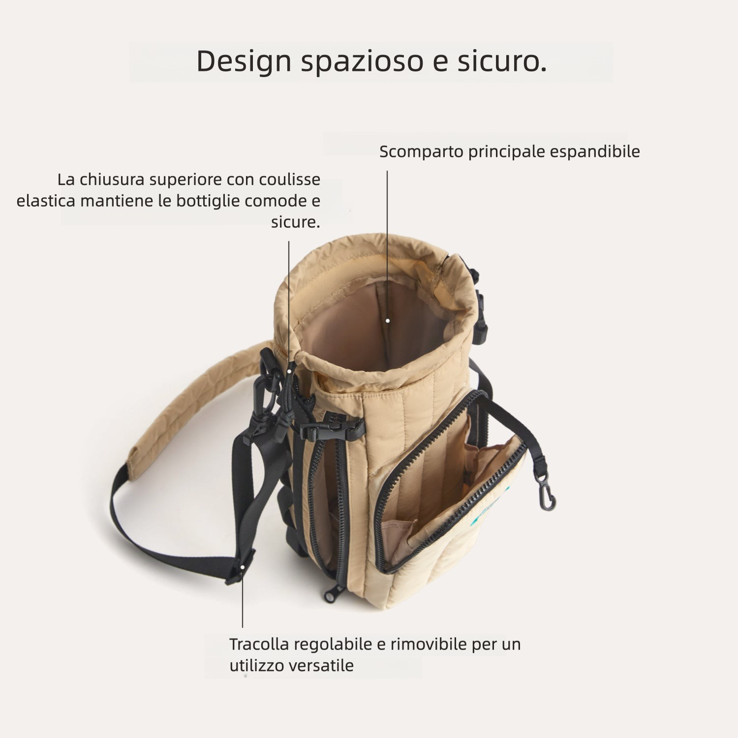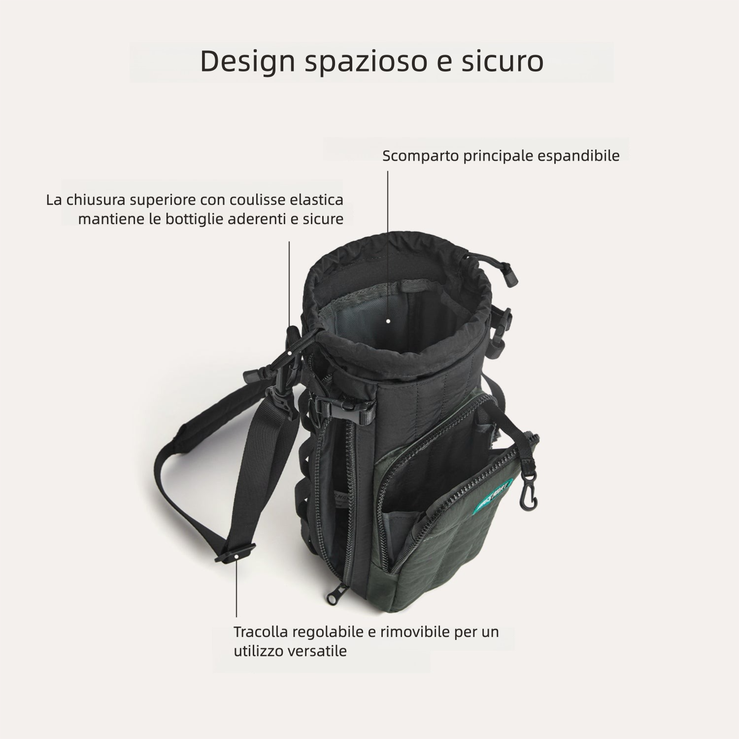 - Zip laterale per bottiglie con manico