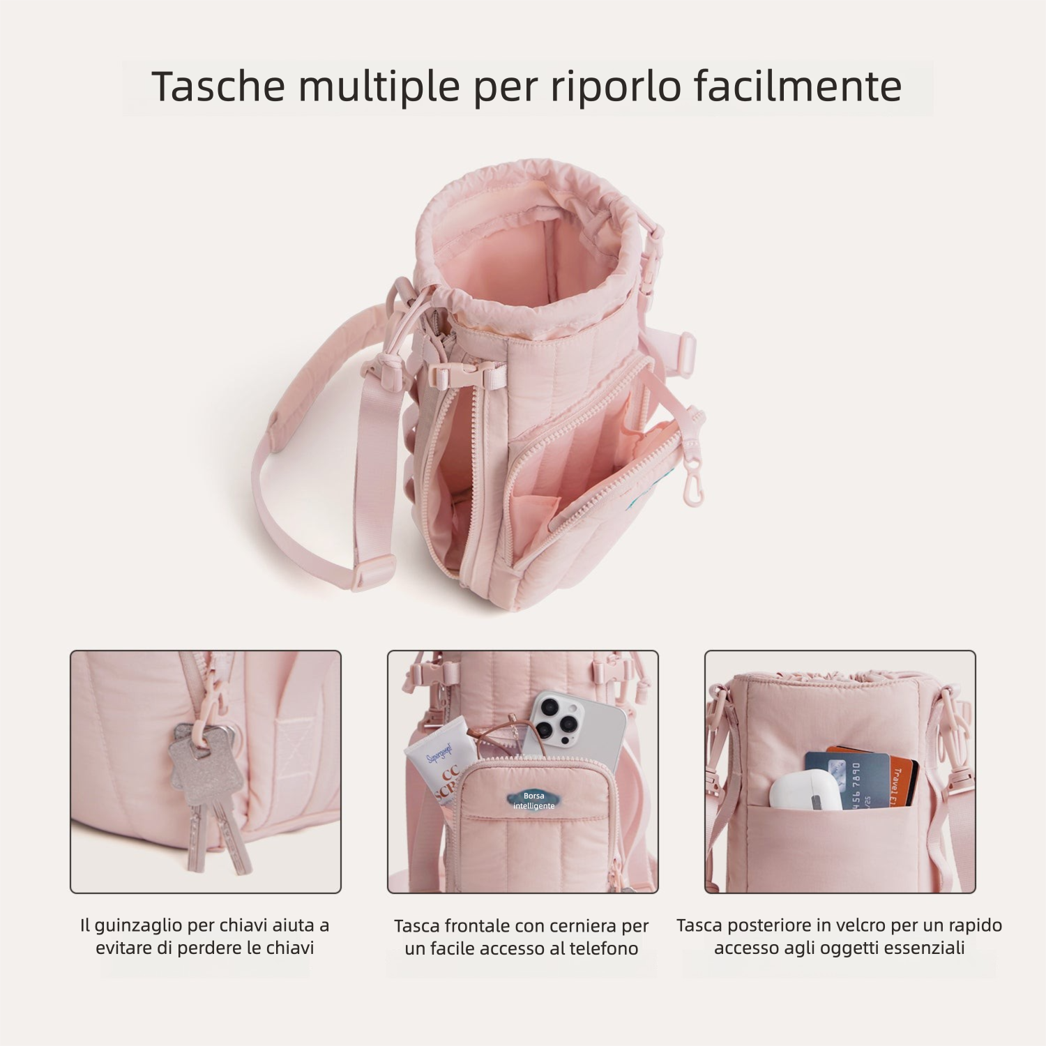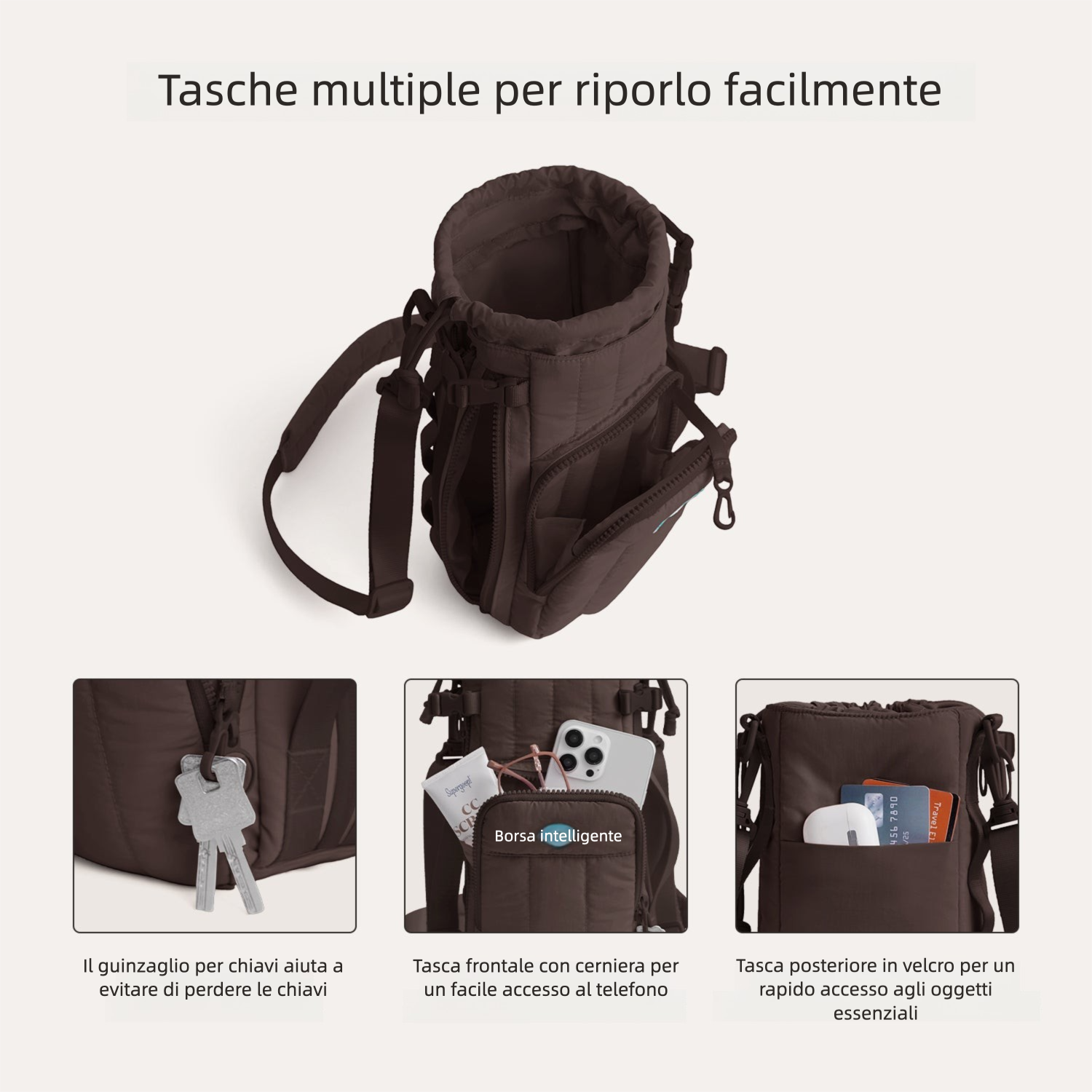 Gli scomparti capienti e le tasche sicure ti permettono di portare con facilità tutto l’essenziale, con uno spazio dedicato per contanti, carte e chiavi. Il tessuto trapuntato, morbido e idrorepellente, è progettato per durare—qualunque sia il tuo stile di utilizzo.
