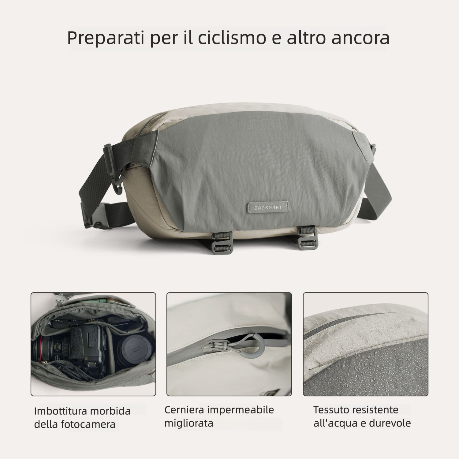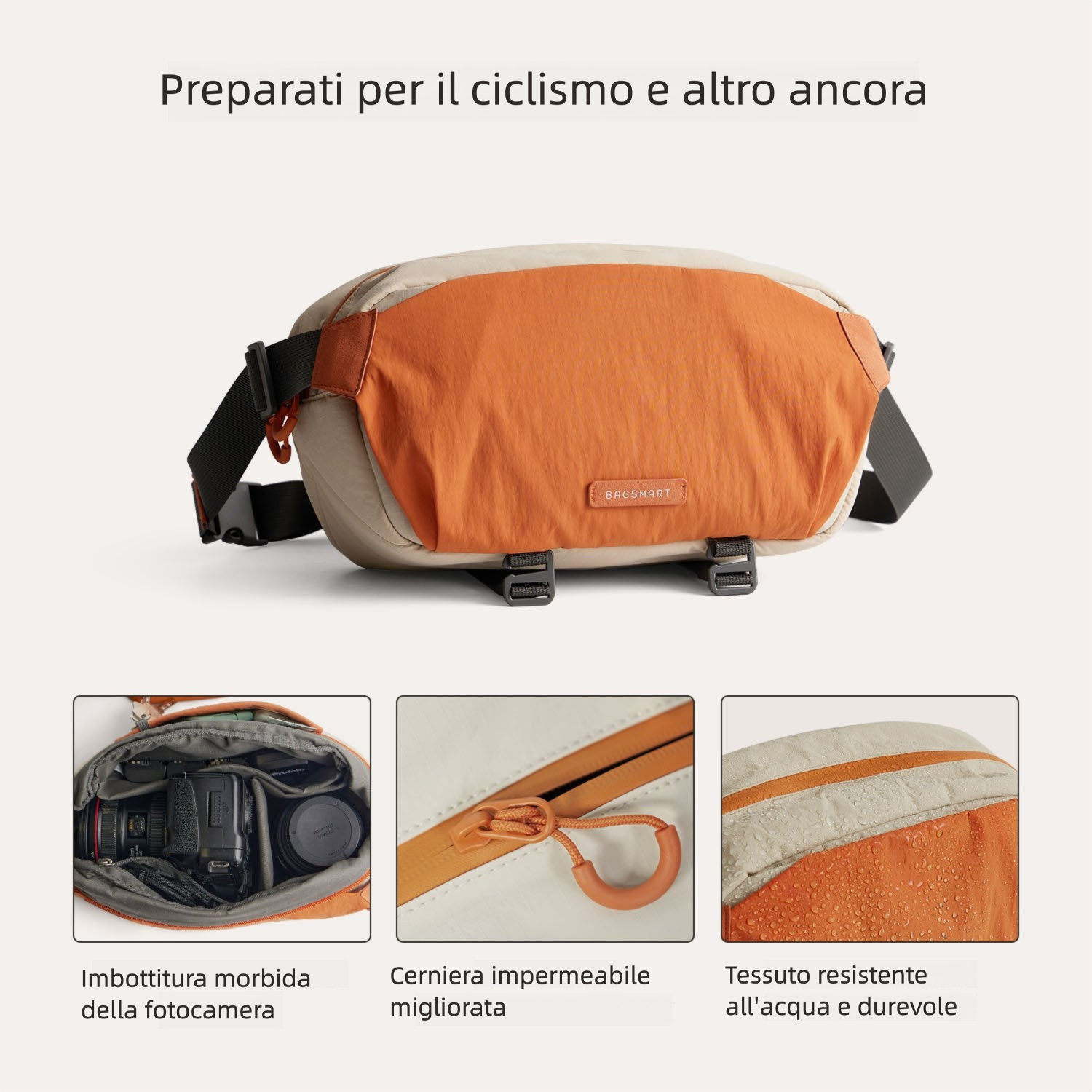 Il tessuto idrorepellente e la capacità espandibile ti tengono pronto allo scatto perfetto, ovunque ti porti il viaggio.